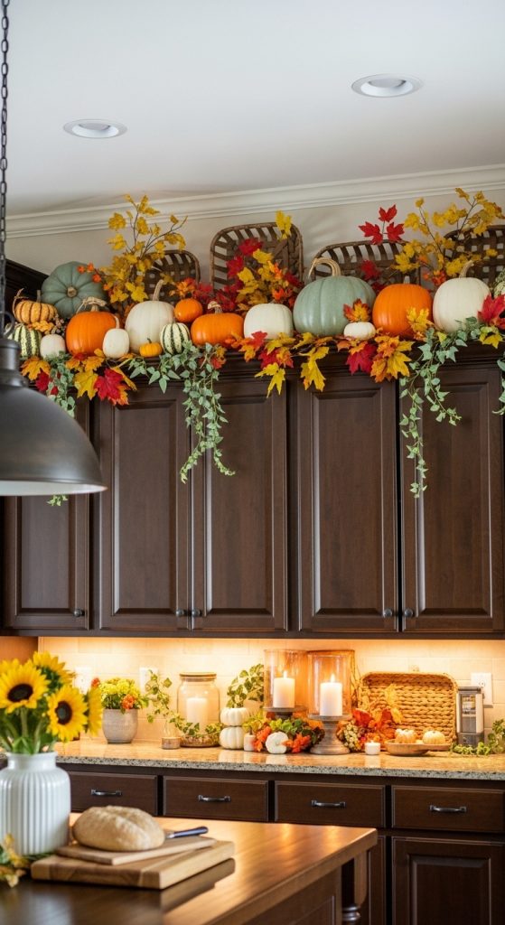 Rotate decorations above cabinets based on the season or holiday. For fall, use pumpkins and dried leaves; for winter, add pine sprigs and ornaments; spring and summer can include fresh flowers or pastel décor.