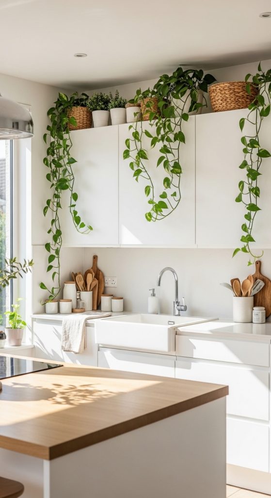 Incorporating greenery above cabinets is a classic way to bring life to your kitchen. Use trailing plants, small potted succulents, or tall statement plants to create visual layers. Arrange pots at different heights and stagger placement to avoid a rigid look. For trailing vines, allow them to cascade naturally for a waterfall effect.