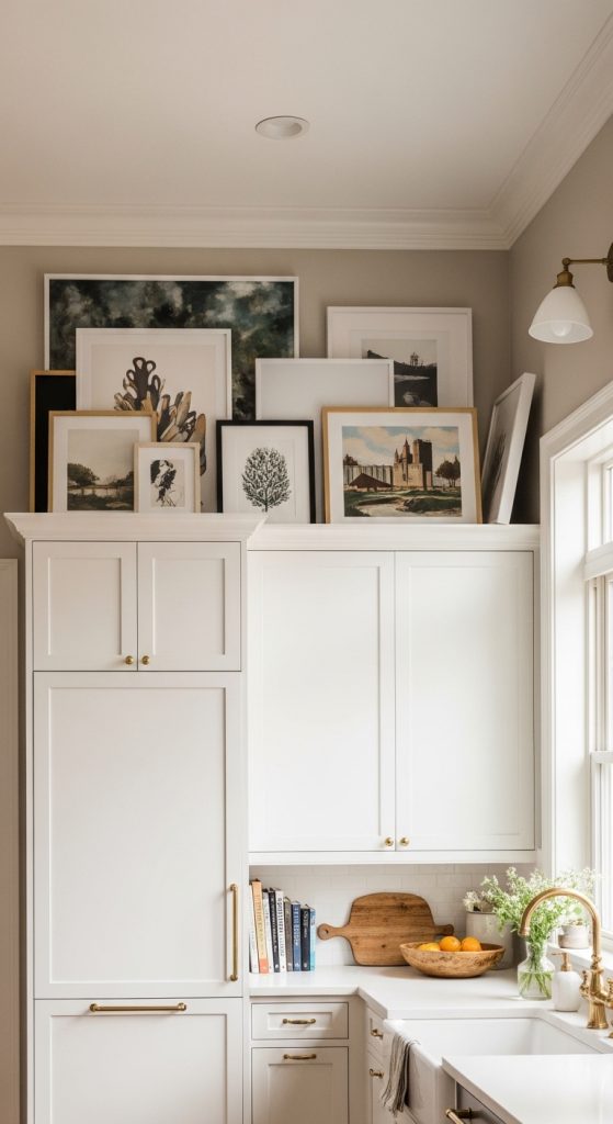 Artwork above cabinets adds a gallery feel. Lean framed prints, canvas paintings, or decorative panels rather than hanging them, which is safer for high areas. Mix vertical and horizontal pieces and layer smaller frames in front of larger ones to create dimension.