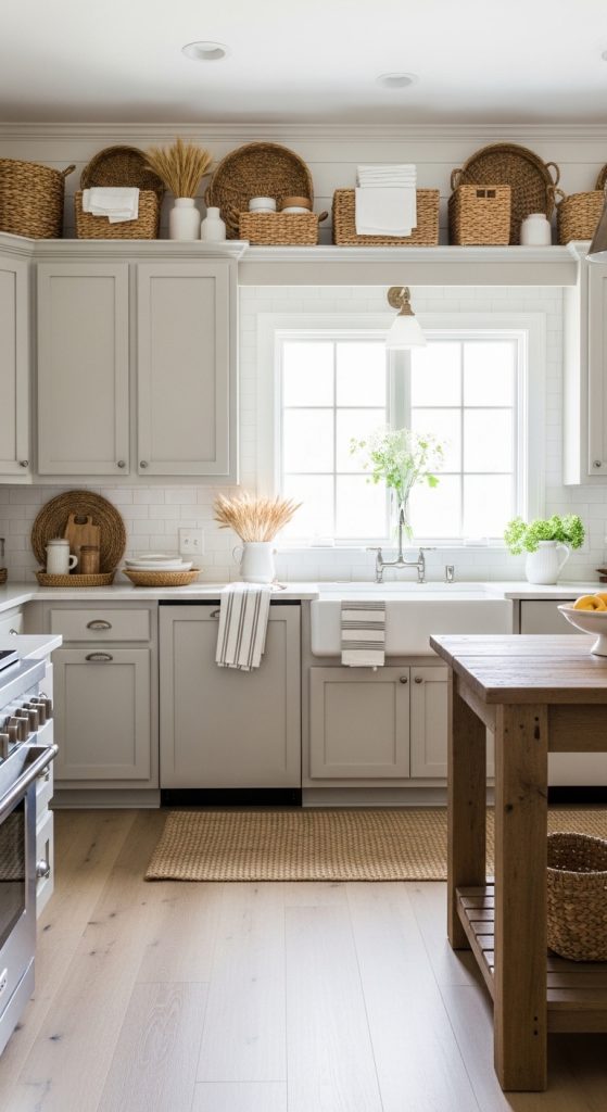 Baskets are stylish and functional for above cabinets. Use woven, rattan, or seagrass baskets to store items like linens, cookbooks, or seasonal décor. Layer baskets by size and height to create a casual, effortless look.