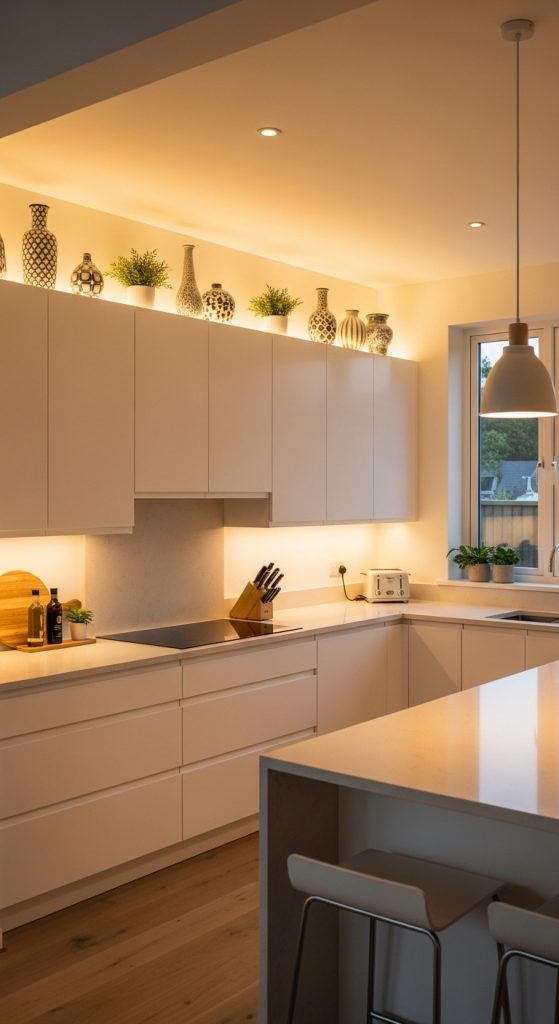 Lighting above cabinets creates ambience and highlights décor. Use LED strips, puck lights, or battery-operated accent lamps. Lights draw attention to decorative items, artwork, or plants while adding warmth to the kitchen.