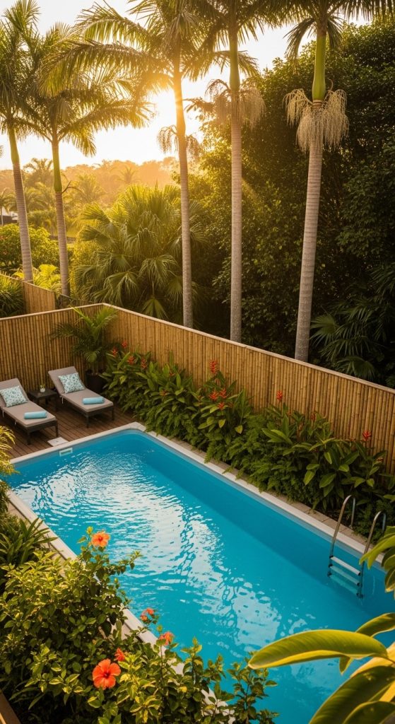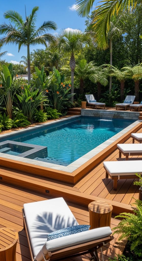 One popular trend is tropical backyard pools, filled with lush greenery and palm trees.