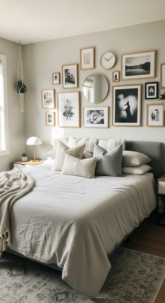 To make the gallery wall cohesive, stick to a color palette or frame style. You can mix vertical and horizontal frames, or include other elements like small mirrors and decorative objects. The gallery wall is especially ideal for bedrooms with high ceilings, as it can fill the vertical space beautifully.