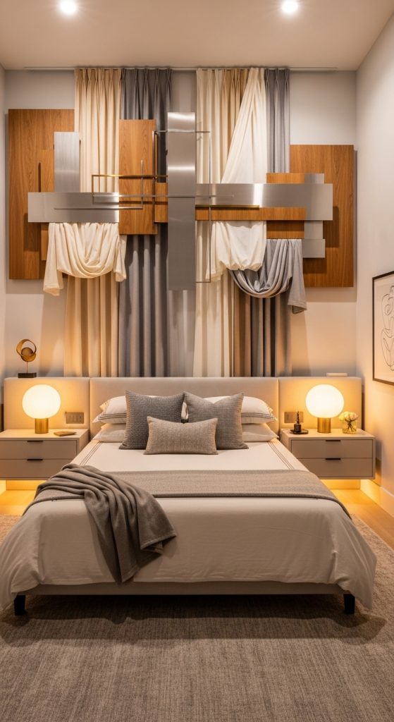 Mixed media installations offer endless creative possibilities and allow you to express your unique style. Whether it’s an abstract composition, a geometric sculpture, or a layered wall piece, this option turns the wall above your bed into a true work of art.