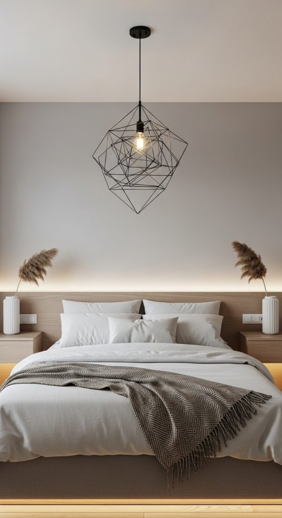 For modern bedrooms, consider geometric or metallic pendant lights. In more traditional spaces, a crystal or vintage chandelier can elevate the elegance of the room. Wall-mounted sconces on either side of the bed also work beautifully, freeing up bedside table space while providing ambient light.