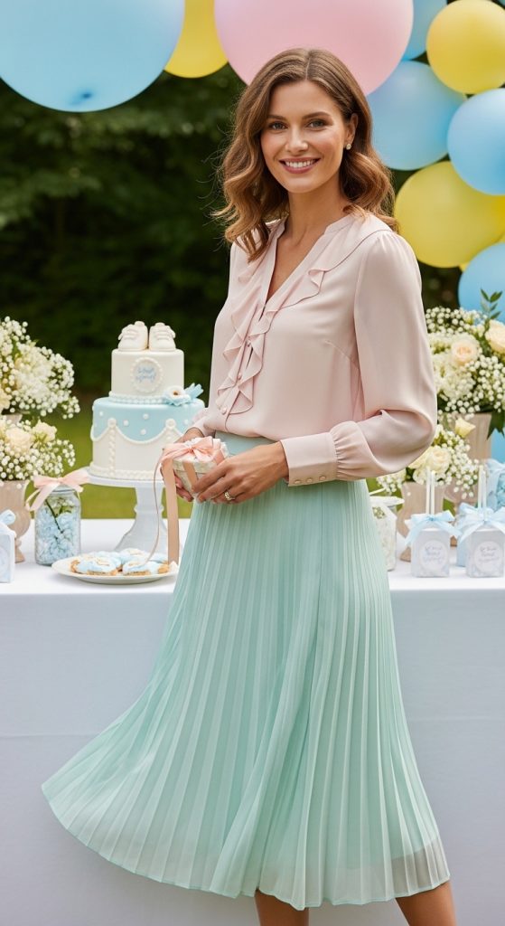 A blouse and pleated skirt combination is a classy and feminine outfit that works well for semi-formal baby showers.