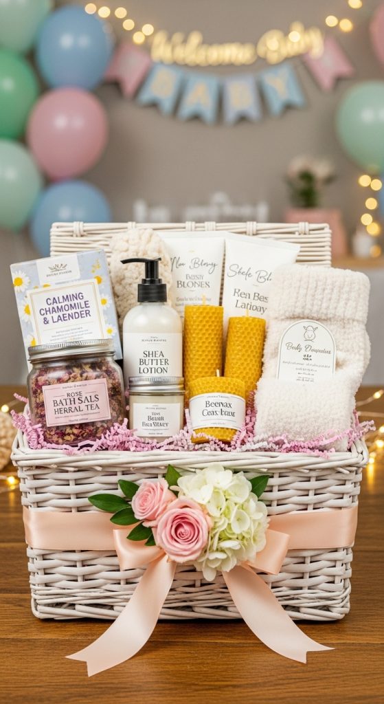 A self-care basket is a thoughtful gift that focuses on the new mother’s well-being.