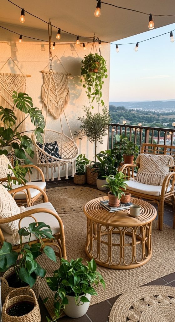 The boho rattan balcony aesthetic is one of the most popular styles. It combines natural materials like rattan, wood, and jute with lush greenery.