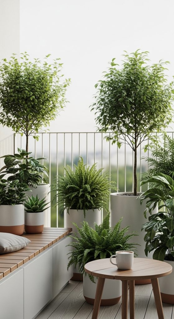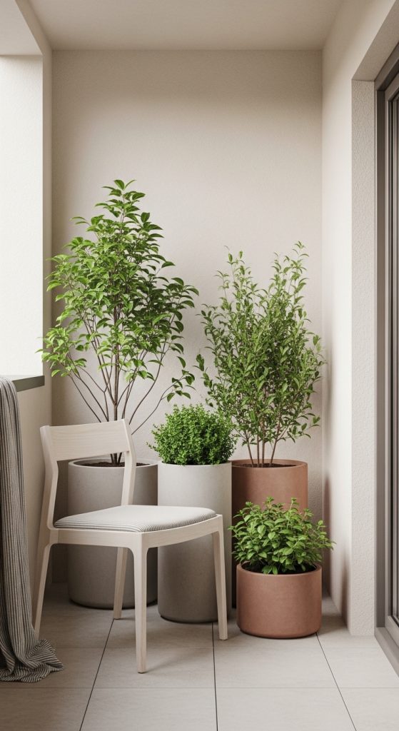 These materials help create a visually balanced and relaxing balcony garden.