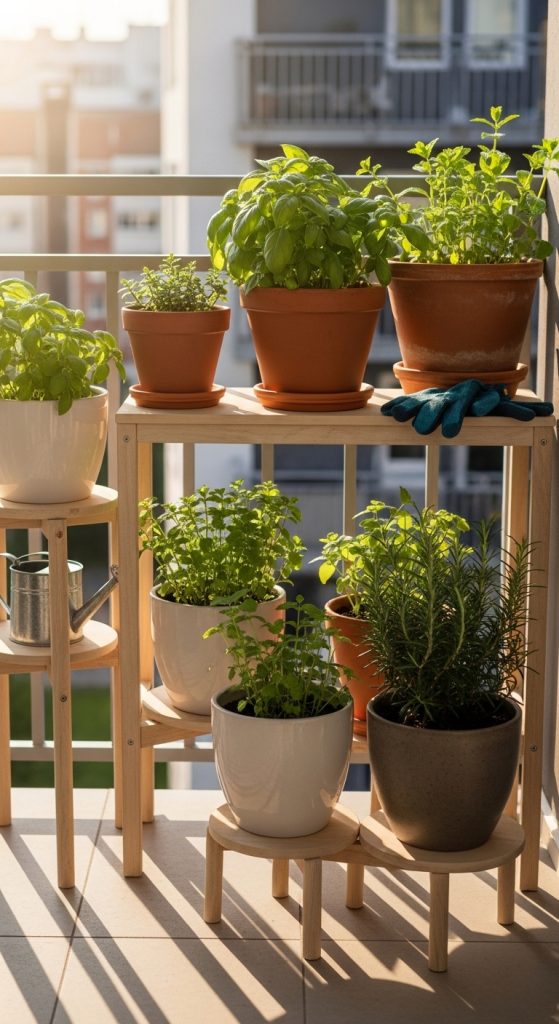 This setup allows you to grow multiple plants in a compact area while keeping the balcony organized.