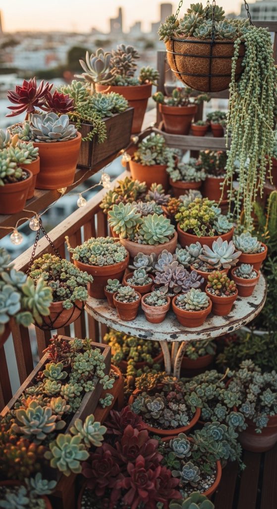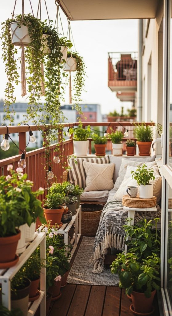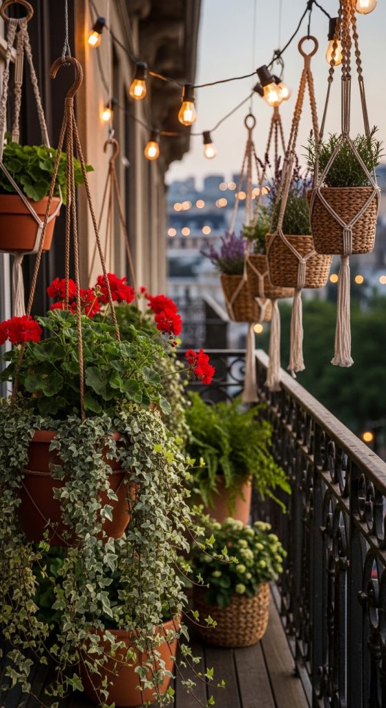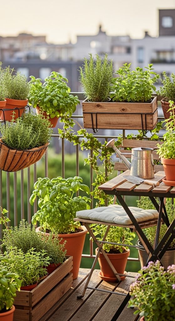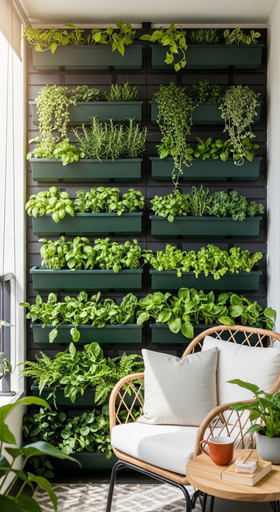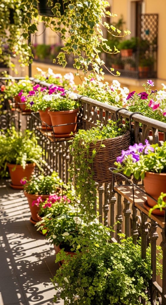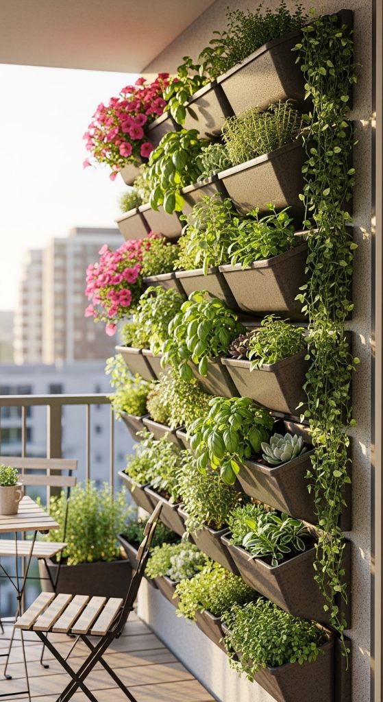 Vertical gardens and railing plant setups are commonly used for small spaces.