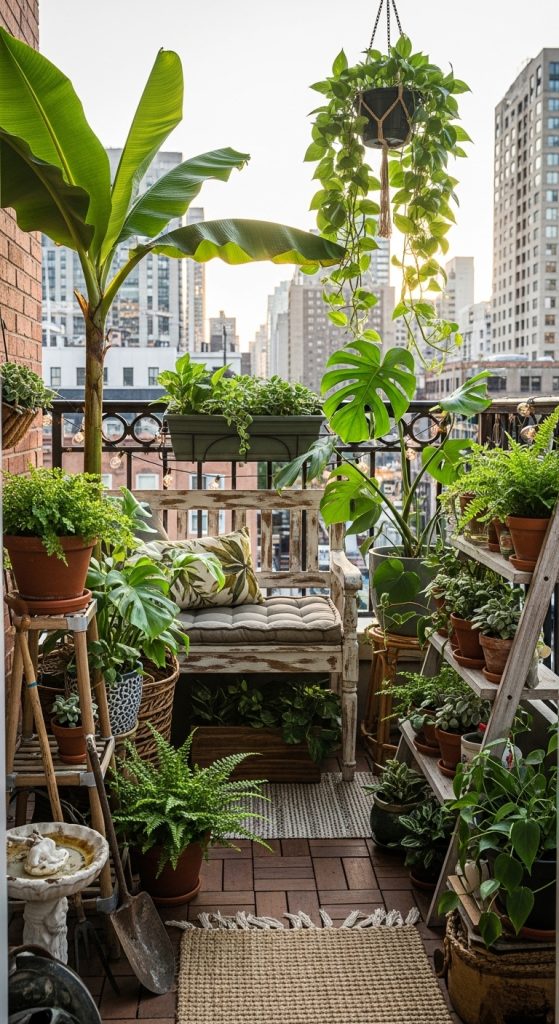 The urban jungle balcony is filled with dense greenery and tropical plants.