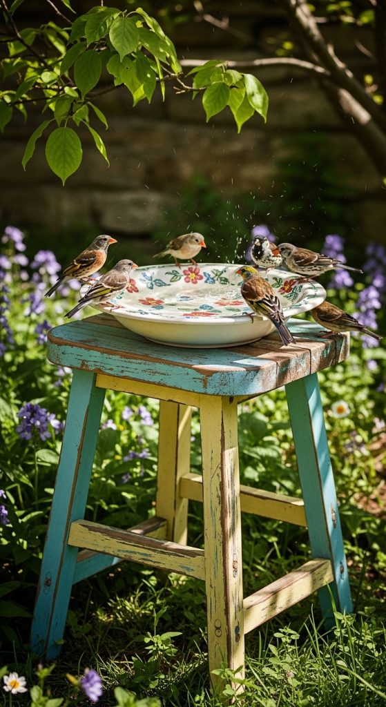An old wooden or plastic stool can be turned into a stylish bird bath stand.