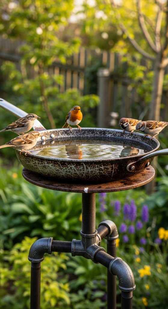 Old frying pans or baking trays can be reused as shallow bird baths.