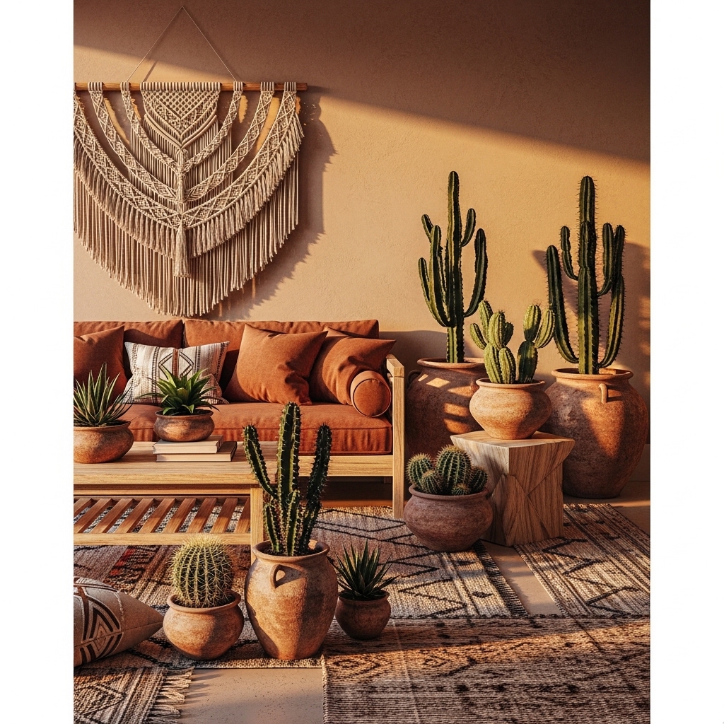 Terracotta, sand, and cactus-inspired decor.