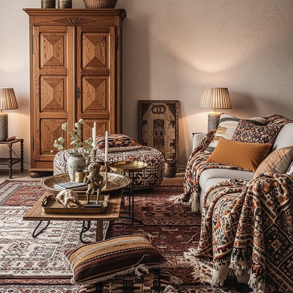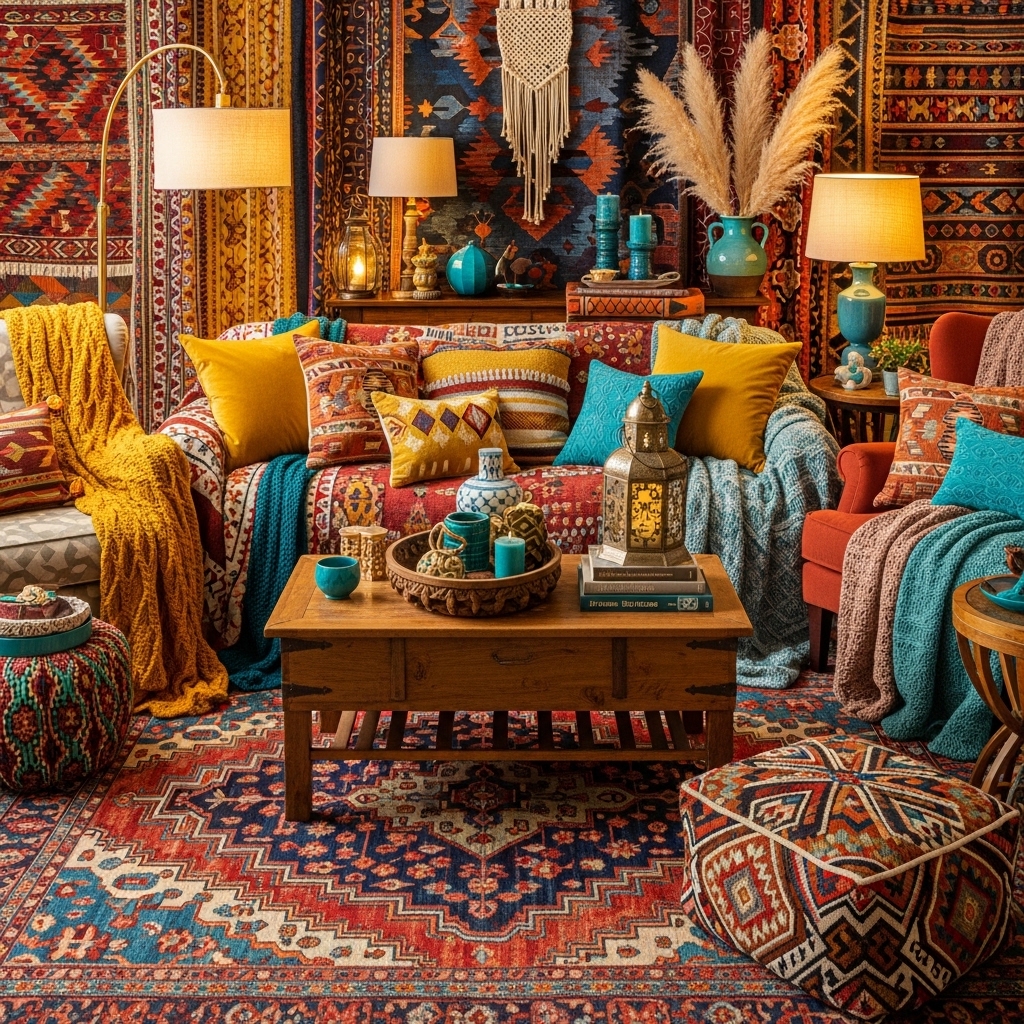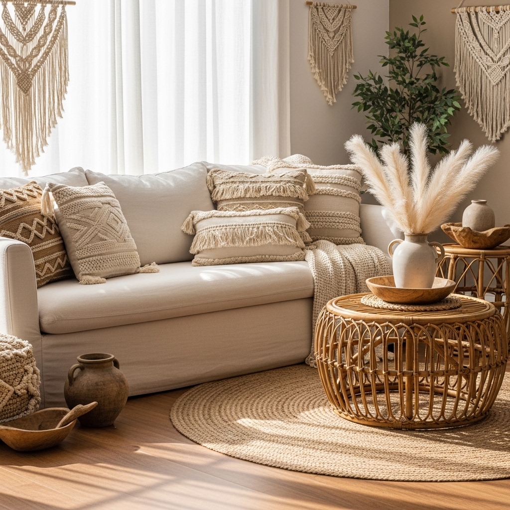 Boho design also works in apartments, small homes, and large open-concept living rooms. It doesn’t require expensive renovations — often, it’s about thoughtful layering. Textiles, plants, wood accents, low seating, and vintage decor pieces can instantly transform a plain living room into a cozy sanctuary.