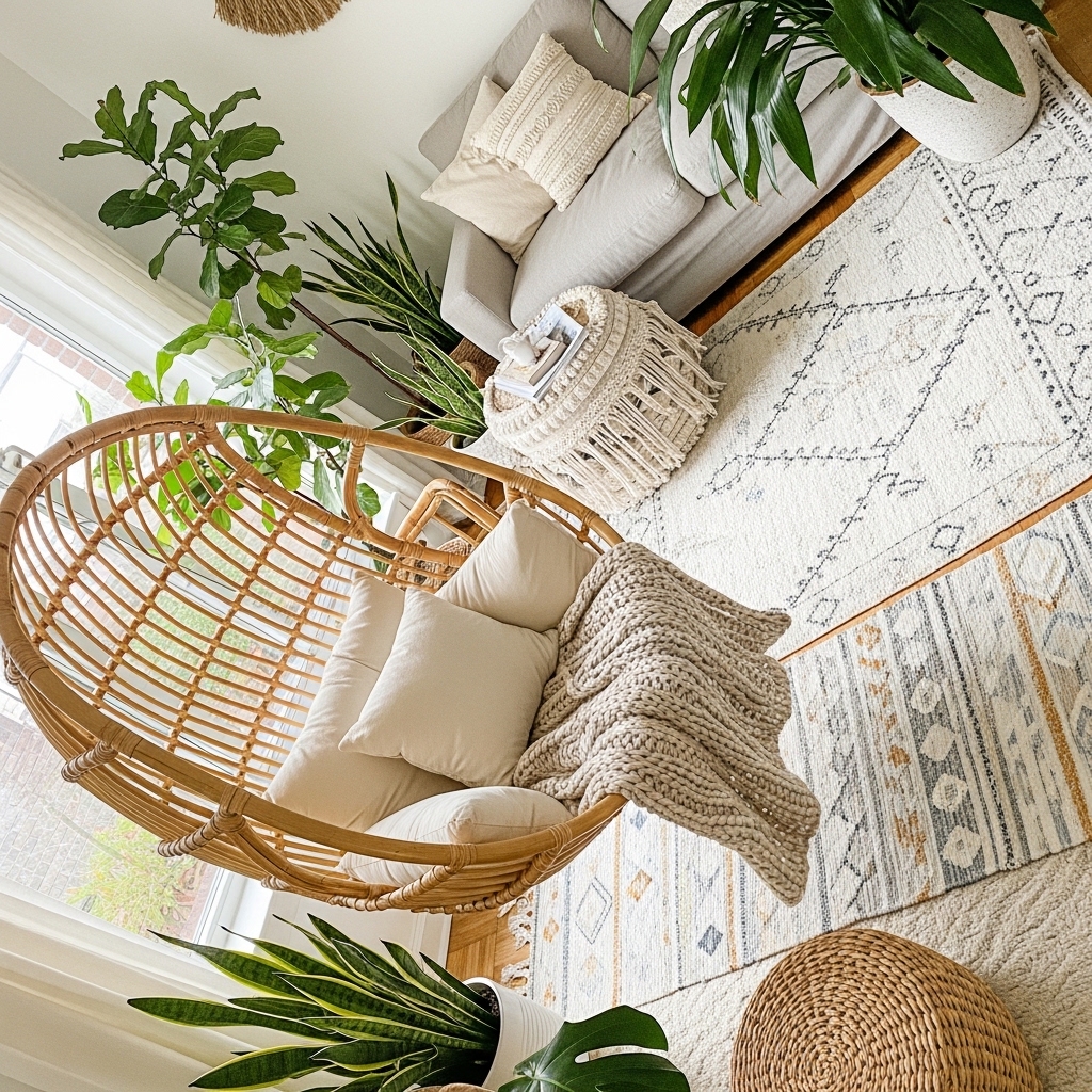 A hanging rattan chair adds playful relaxation and becomes a focal point.