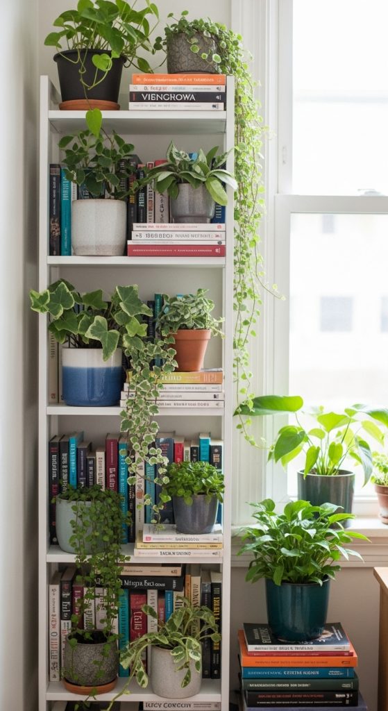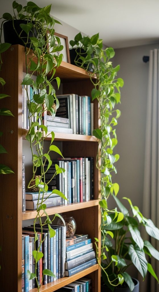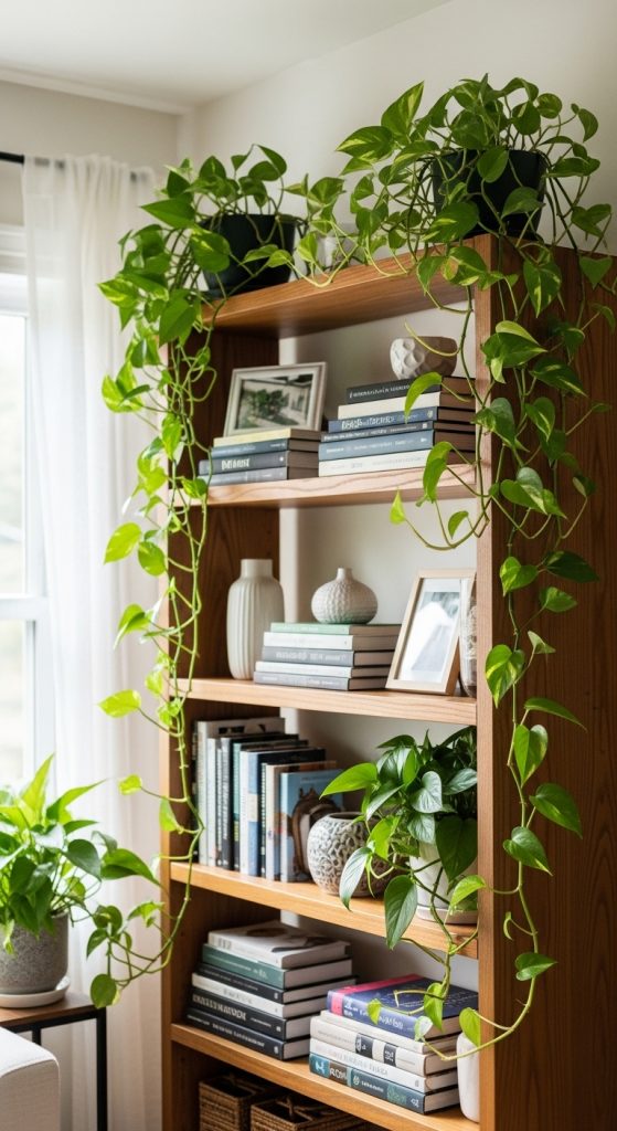 Place trailing plants like pothos or philodendron on the top shelf. Let the vines fall naturally — avoid trimming them too short. Balance the greenery by keeping books neatly arranged below.