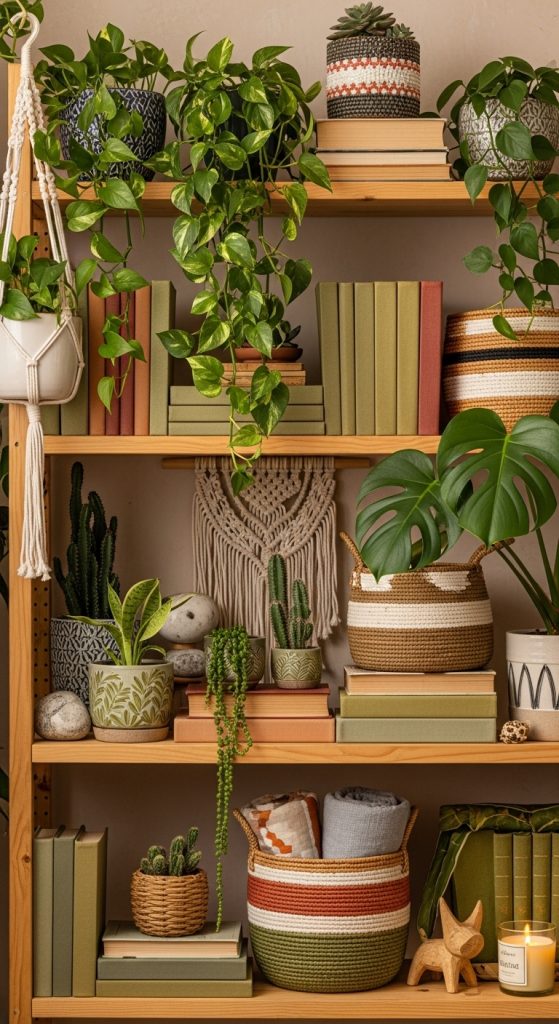A boho bookshelf embraces layered textures, earthy tones, and abundant greenery.