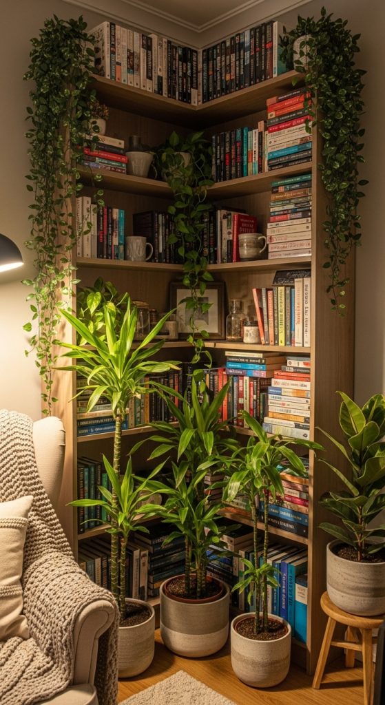 7. Corner Bookshelf with Plants