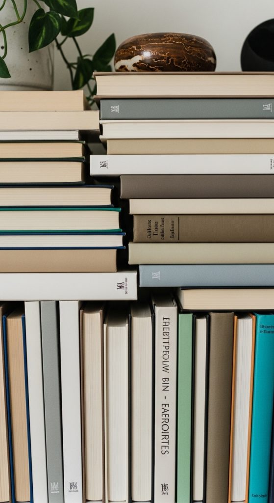 Arrange books in vertical and horizontal stacks. Place a small plant between each grouping. Keep spacing consistent for a clean look.