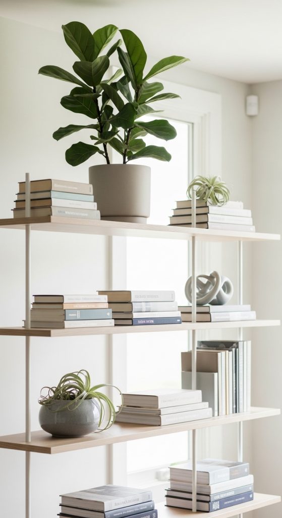 Place taller plants on lower shelves and trailing plants above. Keep books organized to avoid clutter.
