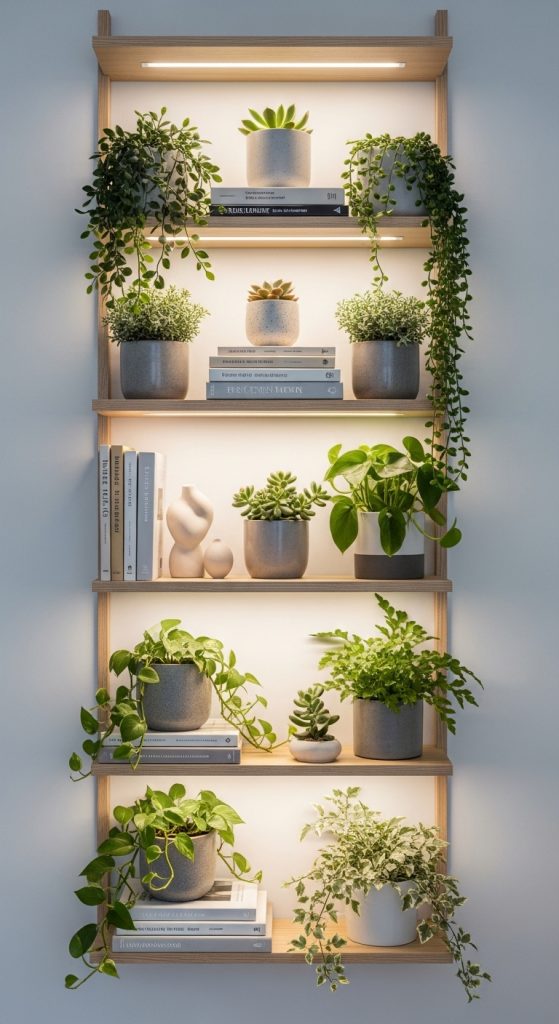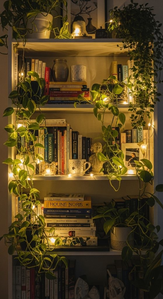 Add small lamps, LED strips, or fairy lights to shelves. Position plants near light sources for a warm glow.