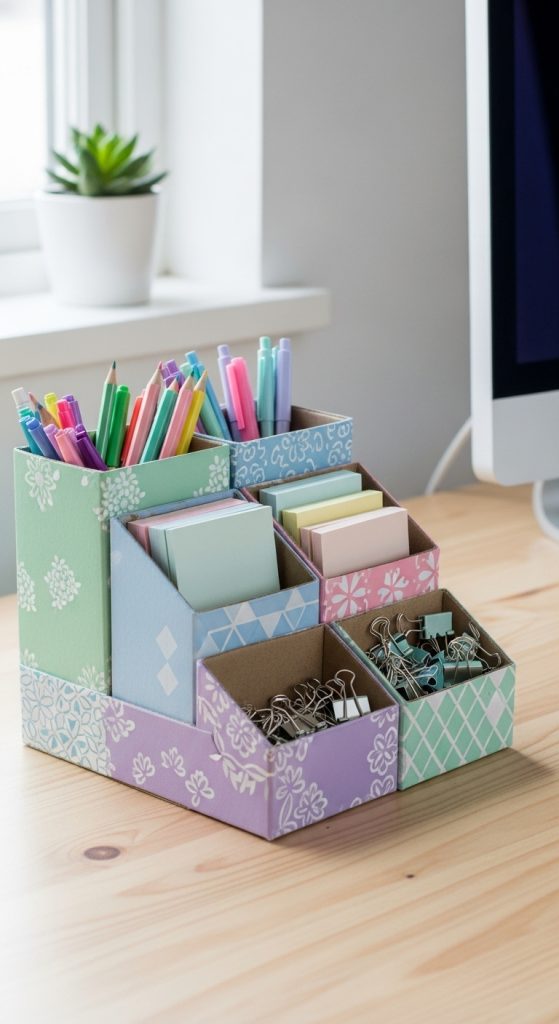 A well-organized desk can boost productivity, and cartons are perfect for creating a custom desk organizer. You can create sections for pens, paper clips, sticky notes, and more.