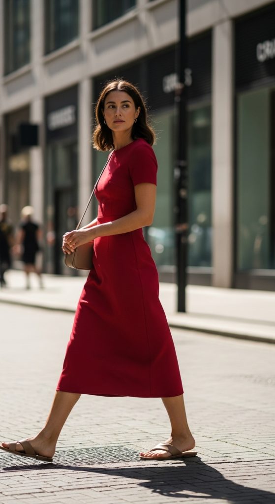A cool red midi dress strikes the perfect balance between elegance and wearability. The midi length feels sophisticated while remaining comfortable and practical for various occasions.