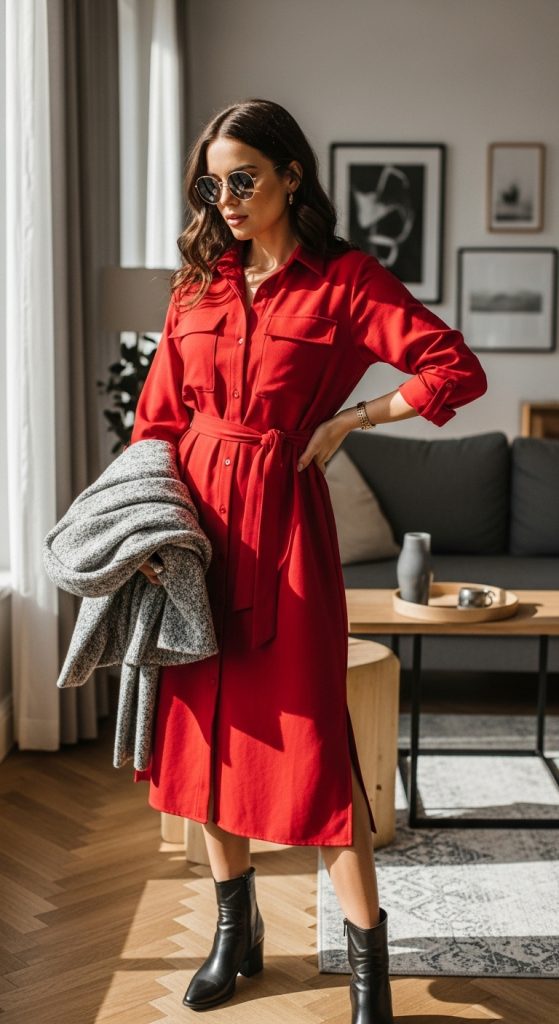 A cool red shirt dress offers a relaxed yet stylish option for everyday wear. This design feels effortless and modern.