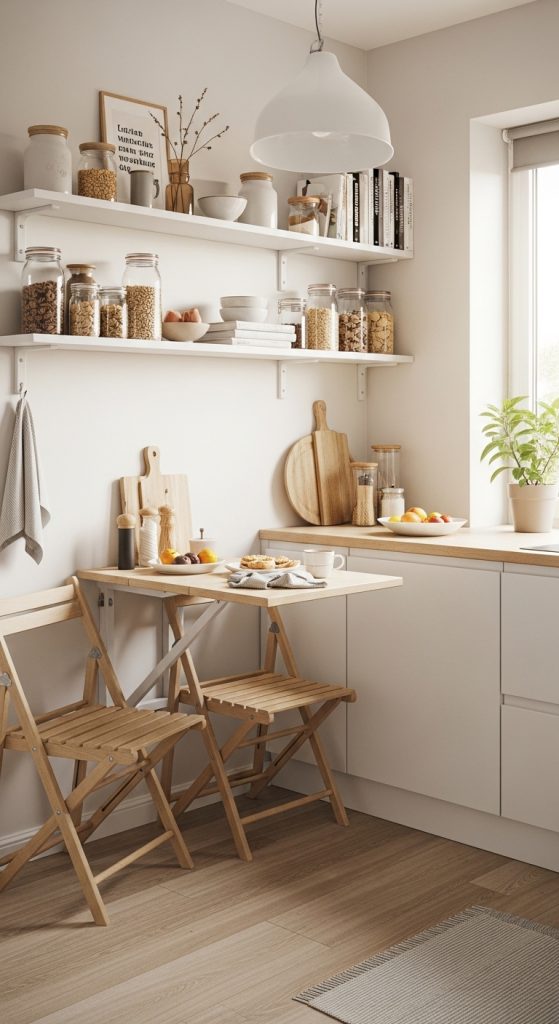 A fold-down table can provide additional workspace and dining space in a tiny kitchen.