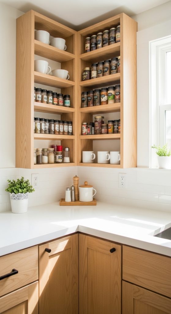 Corners are often underused in tiny kitchens but can provide valuable storage.