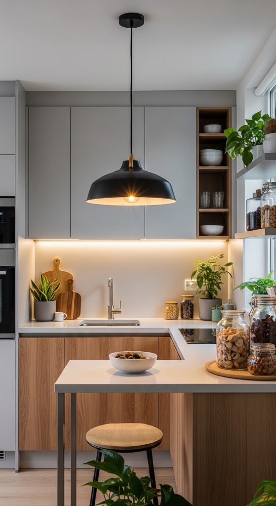 A stylish lighting fixture can transform a tiny kitchen into a design focal point.