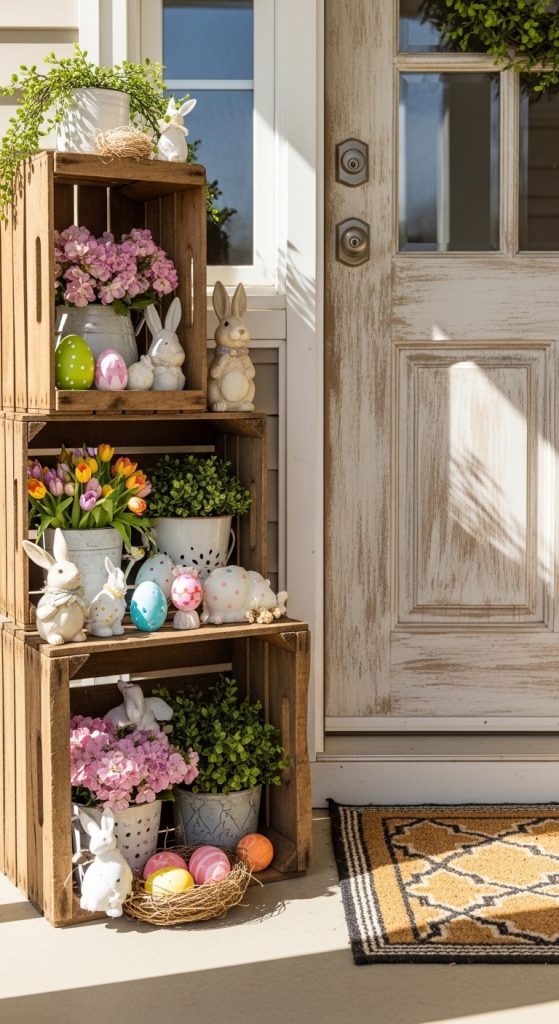 Stack wooden crates beside the door and fill them with flowers, eggs, and bunny decorations.