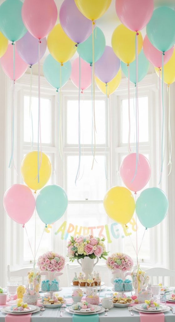 Hang pastel balloons from the ceiling using ribbon or string.