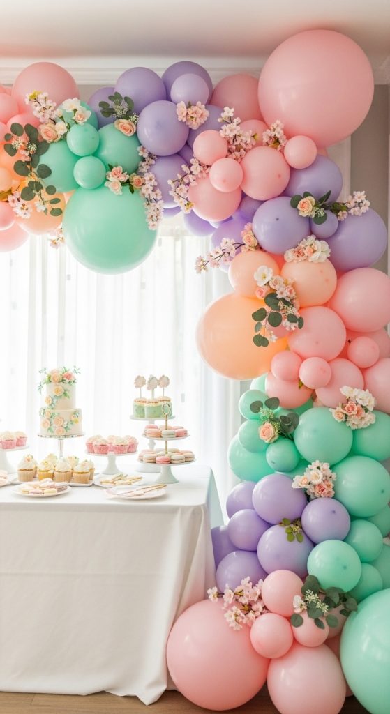 Create a pastel balloon garland and insert artificial flowers or greenery between the balloons.