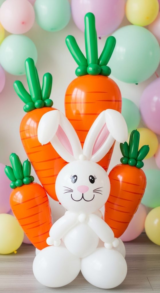 Use white balloons for bunny shapes and orange balloons for carrot designs. Add green balloons to represent carrot leaves.