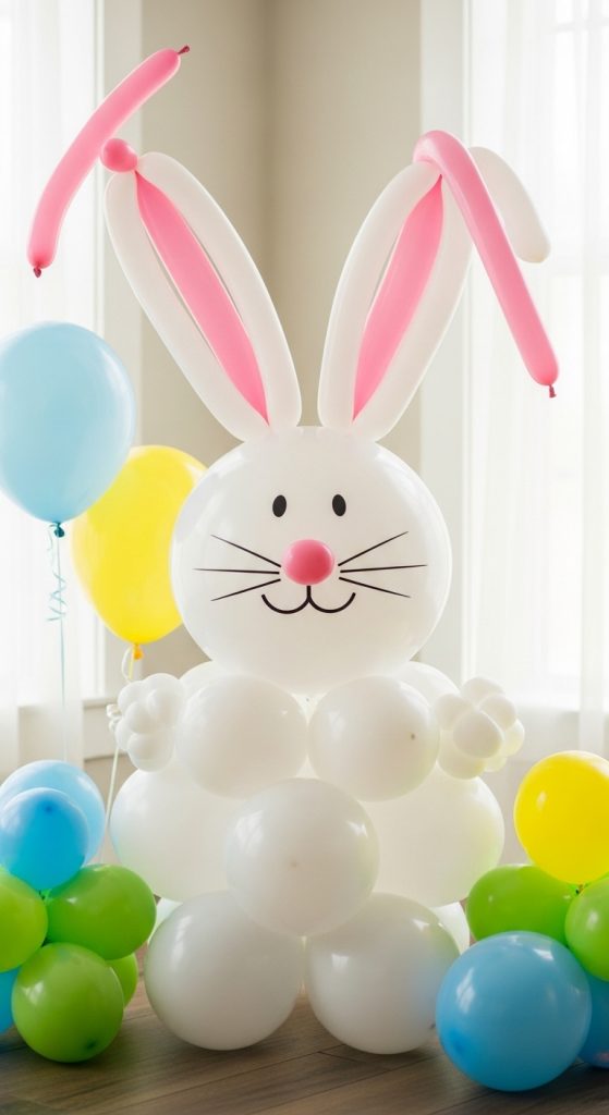 A bunny-shaped balloon display adds a playful touch to Easter decor.