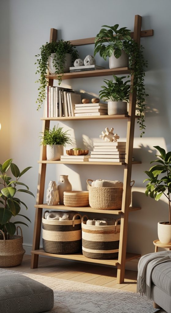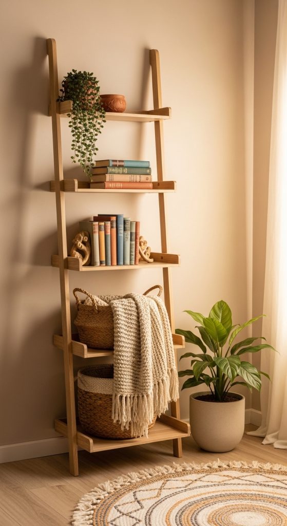 Ladder-style shelves lean against the wall and require minimal installation, making them beginner-friendly.