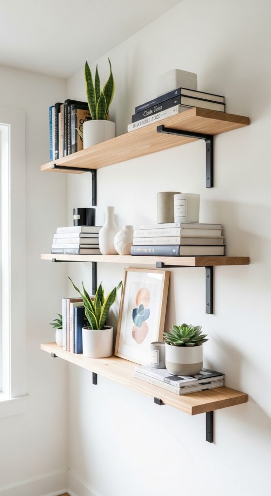 This is one of the easiest and most reliable DIY shelving ideas. A wooden board supported by brackets creates sturdy, functional shelves that work in any room.