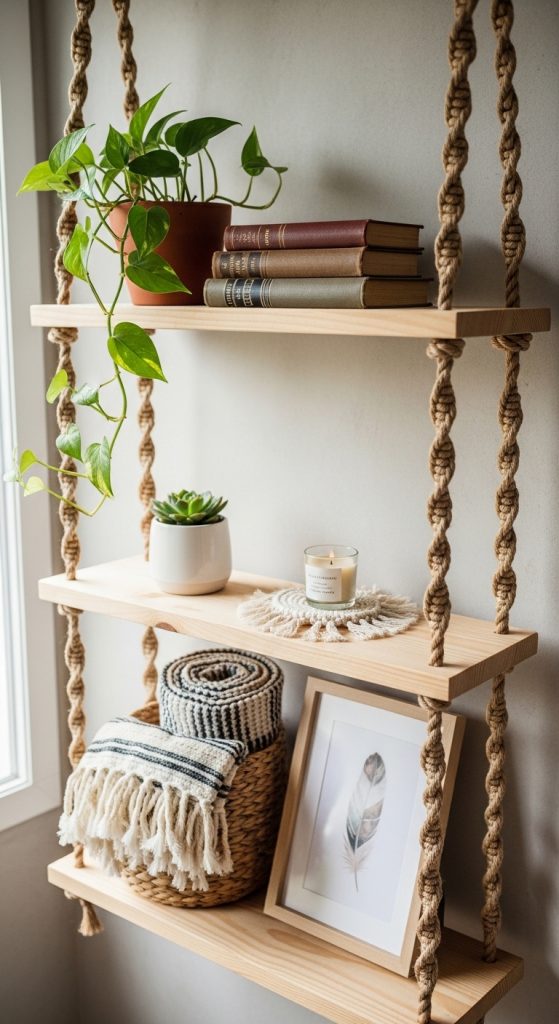 Rope shelves are lightweight, decorative, and beginner-friendly. They’re great for small items and decor.