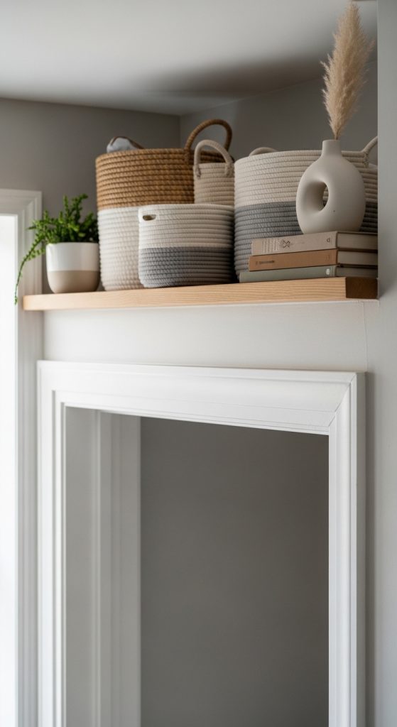 Adding a shelf above a doorway creates storage without taking up usable wall space.