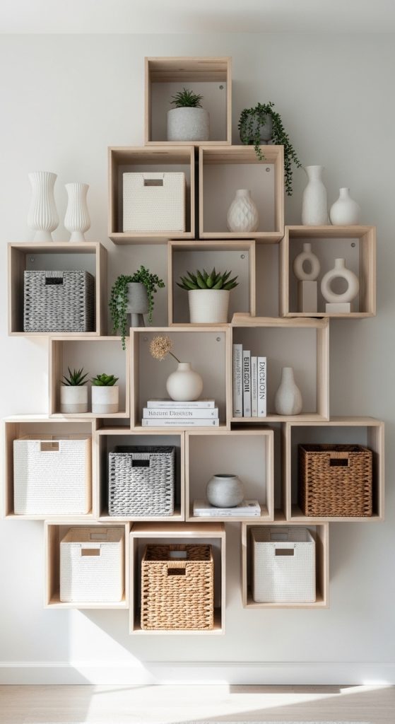 Box or cube shelves add structure and visual interest while remaining easy to install.
