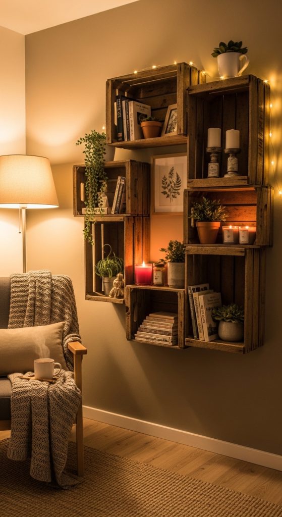Wooden crates can be repurposed into easy wall shelves. They add storage and character with very little work.