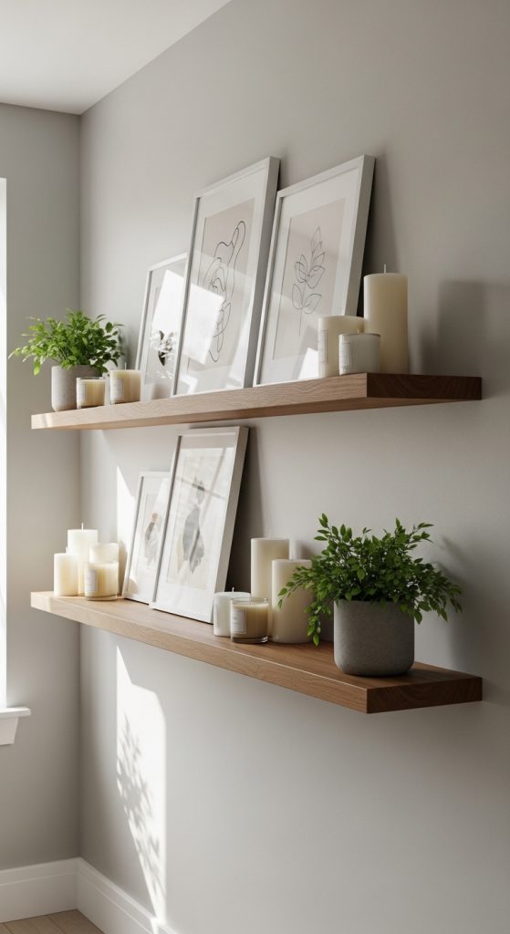 Floating shelves create a clean, modern look with minimal effort. They hide brackets inside the shelf, making the design appear seamless.