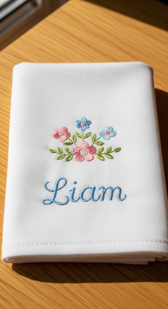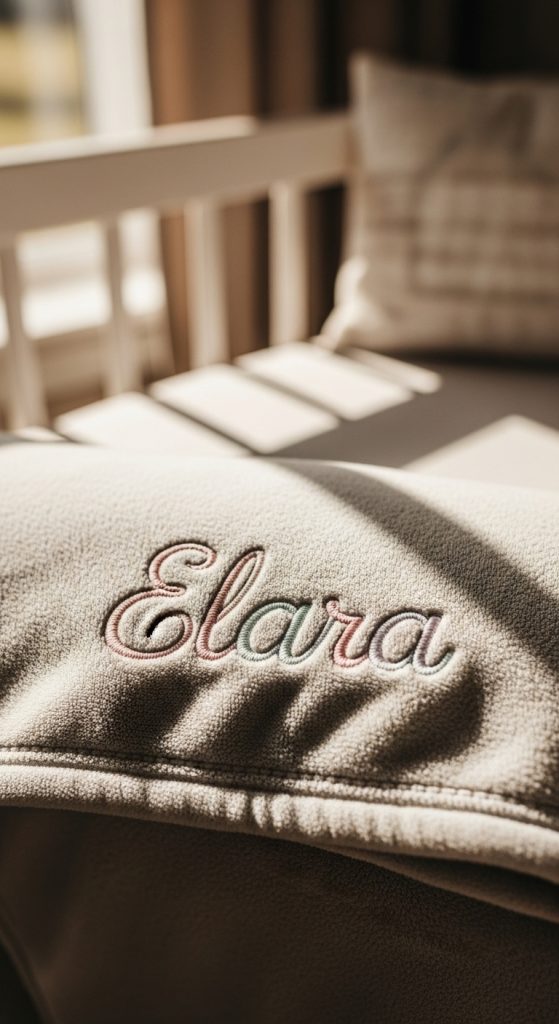 Embroidered baby name blankets feature the baby’s name, initials, or birth details stitched onto soft fabric. These blankets are often used daily but also saved as keepsakes.