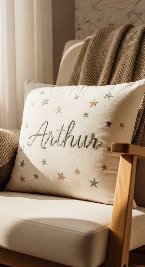 Decorative pillows embroidered with names or quotes for nursery decor.