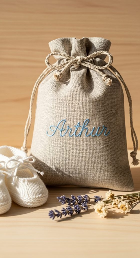 Small fabric bags embroidered with names for storing baby mementos.