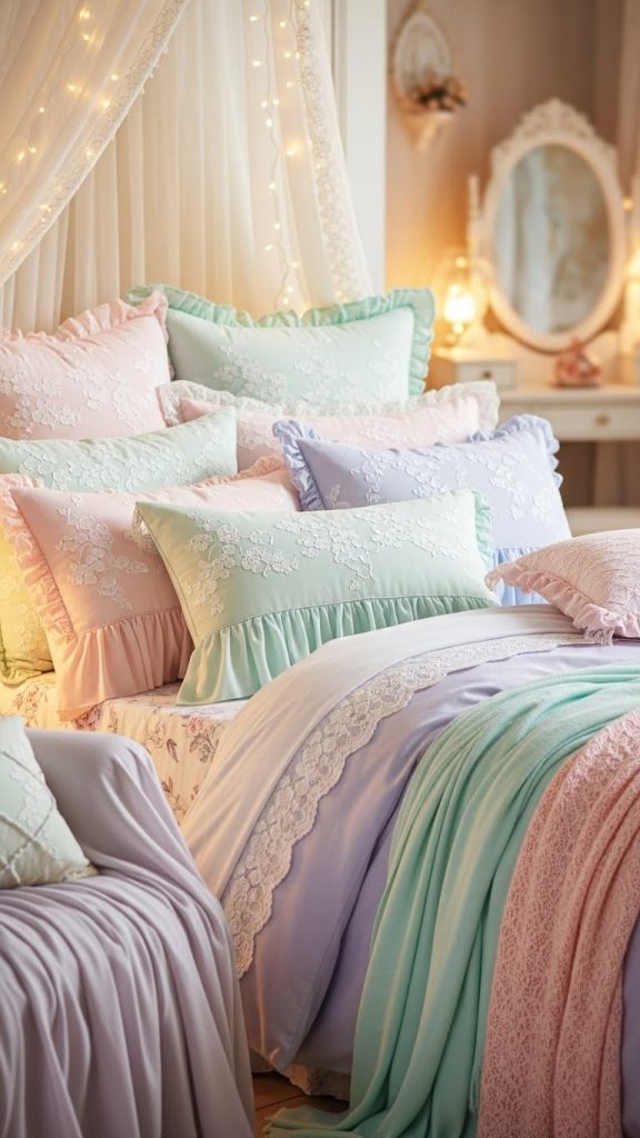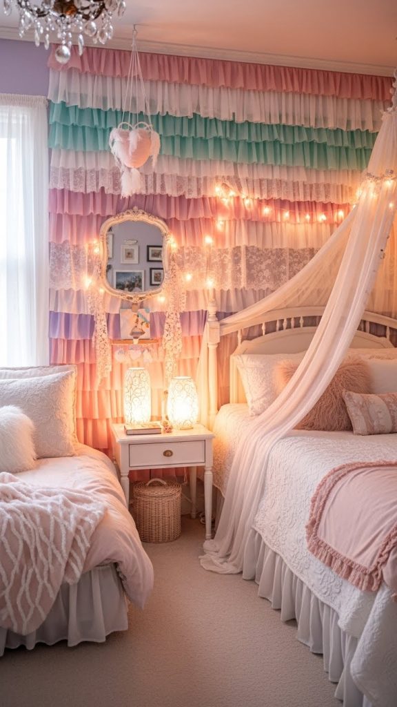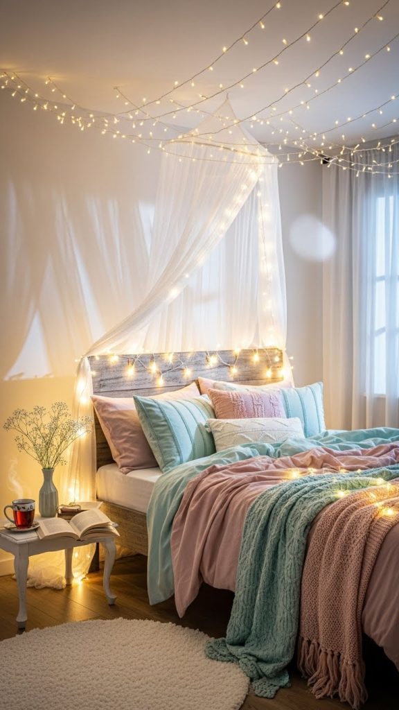 The color palette of a fairy bedroom sets the tone for the entire space. Soft pastels like blush pink, lavender, mint green, baby blue, and creamy whites create a light, dreamy environment. Complement these colors with warm lighting from fairy lights, lanterns, or soft table lamps. Layering lighting ensures your room feels cozy and magical at all times.