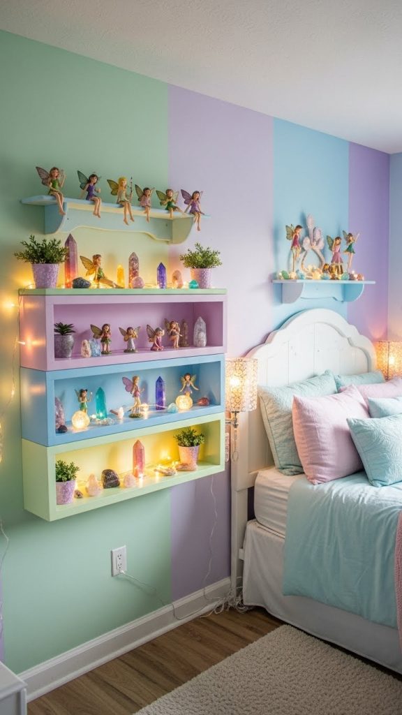 Wall shelves are both functional and decorative, especially in a fairy bedroom. They are perfect for displaying fairy figurines, miniature houses, crystals, or potted plants. Wooden shelves painted in pastel shades or adorned with lace and vines can look like they belong in an enchanted forest.